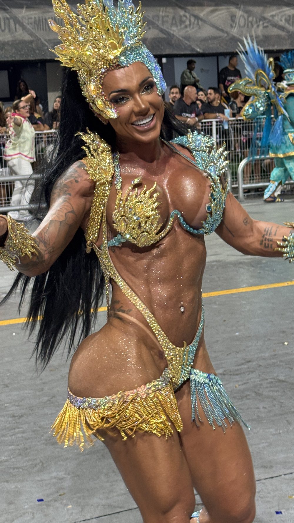 Com autorização do jogador Ewerton Cebolinha, presidente da agremiação, a musa optou por um figurino mais leve, sem o costeiro tradicional da fantasia. A escolha garantiu mais liberdade de movimento para sambar, interagir com o público e aproveitar cada momento do desfile.