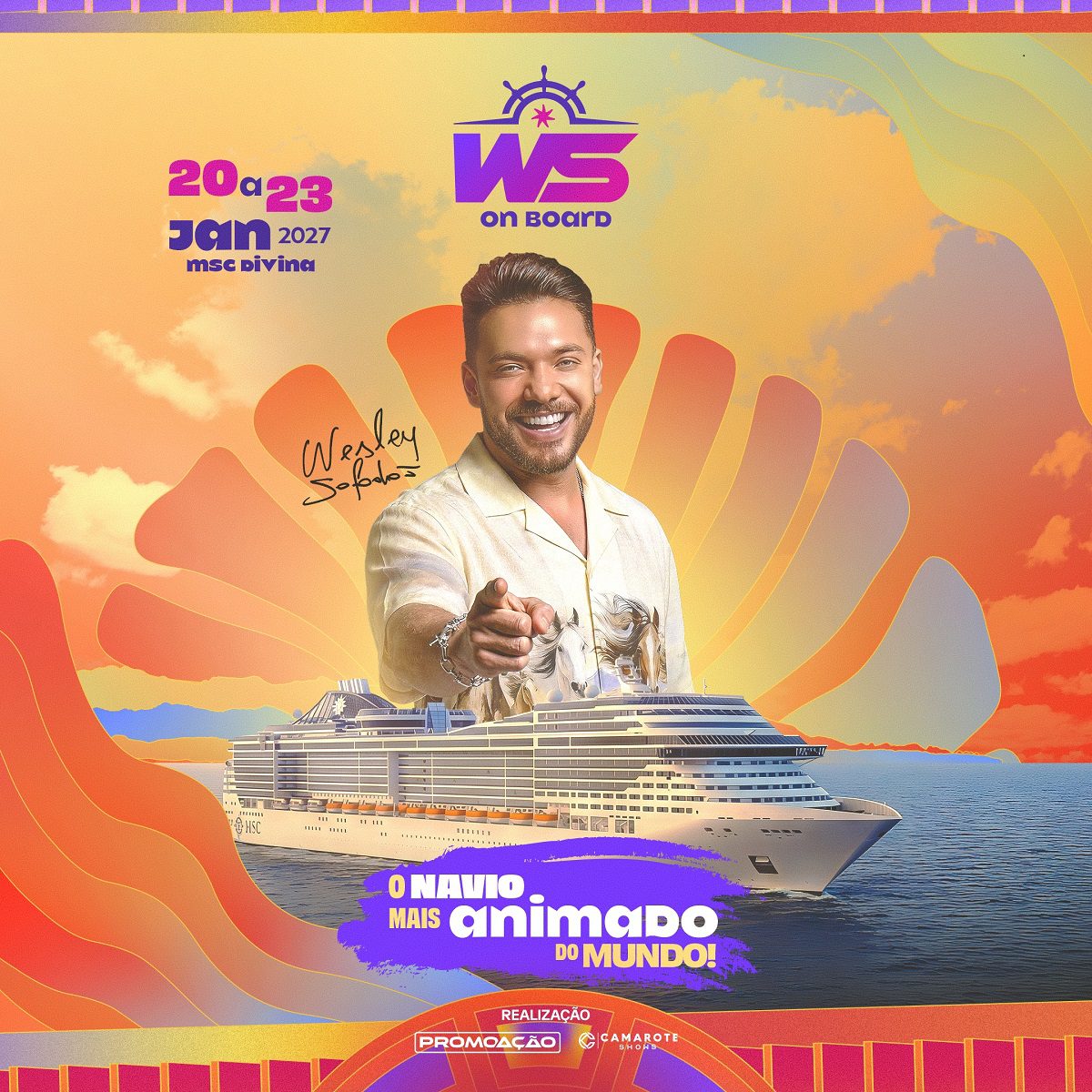 Os fãs de Wesley Safadão já podem se preparar para mais uma grande festa em alto-mar. O cantor anunciou a sétima edição do cruzeiro temático WS On Board, que acontecerá entre 20 e 23 de janeiro de 2027, reunindo música, festas e experiências exclusivas durante três dias de viagem.
